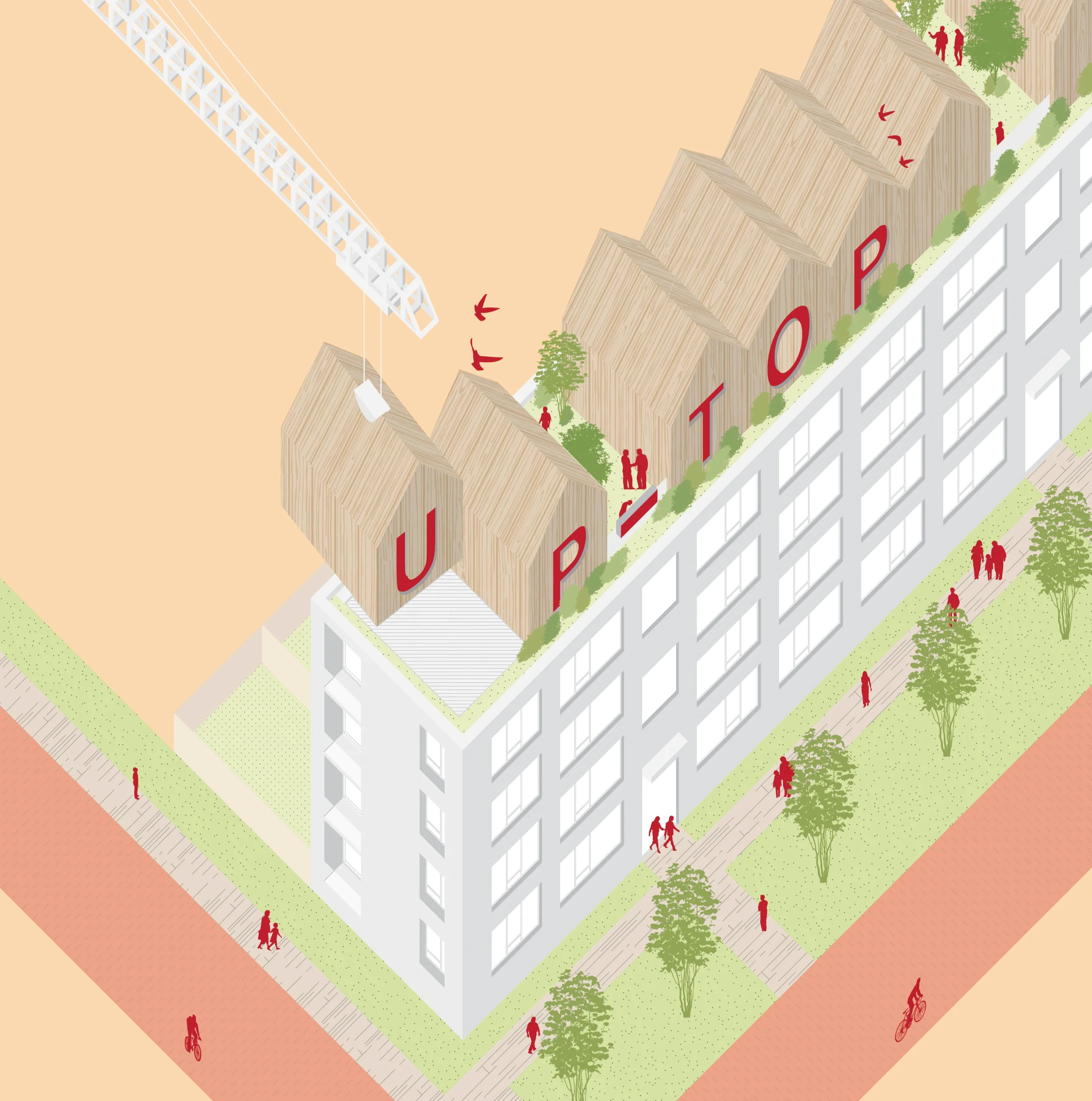 UP-TOP benadert optoppen als een architectonische en ruimtelijke ontwerpopgave. Door voort te bouwen op wat er al is, wordt materiaalgebruik beperkt, blijft de stedelijke structuur intact en wordt de druk op schaarse openbare en groene ruimte geminimaliseerd. Het project onderzoekt waar woningbouw mogelijk is, zonder de stad verder te fragmenteren of te belasten.
